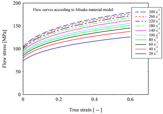Flow curves according to Misaka’s material model as a function of strain and strain rate (20–300 s−1) at a temperature of 1100 °C.
