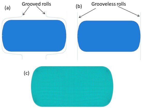 Examination of formation either single or double barrel form by the FE method is conducted using a 2D model, as shown in Figure 10. The model geometry is equivalent to the strip, resulting from stand 13 and entering the edging pass, having dimensions of 16.2 mm height (H) and 32.9 mm width (W) with an aspect ratio (W/H) of 2.03. The model is meshed into 2266 elements (Figure 10c) of reduced quadratic plane strain type. Figure 10a shows the idealized sample entering stand 14 to be edged using grooved rolls. Alternatively, Figure 10b shows similar samples prior to deformation using grooveless rolls, having alike dimensions as prescribed above. The strip has been numerically simulated by through deformation and reduction in width (W) from 32.9 to 24.5 mm.