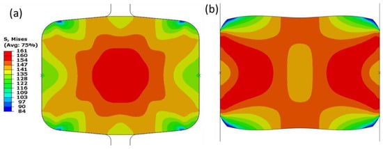 Figure 11 shows the stress distribution of the deformed strip under the edging using grooved and grooveless rolls. The deformation restriction caused by the grooved roll has forced the material to flow from the lateral sides to the strip center (central bulging) of the sample, as presented in Figure 11a. The stress distribution shows a concentrated pattern of high stress in the middle of the sample, which changes grooveless rolls into shear bands or double rounded top isosceles triangles, as shown in Figure 11b. This represents a typical deformation pattern of material once subjected to compression loads, especially under quasi static deformation condition [].