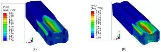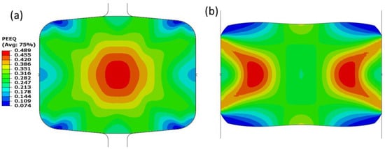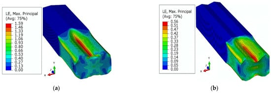 The strain distribution (Figure 12) indicates a similar pattern as stress (Figure 11). Moreover, deformation using a grooveless roll (Figure 12b) showed larger dead or slightly deformed regions at the top and bottom areas. This is mainly due to the unrestricted lateral flow (to the top and bottom of the strip) of the deformed material, forming a dogbone shape.