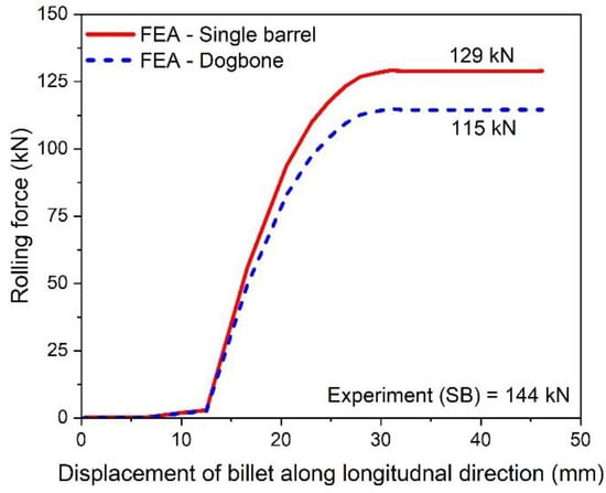 where, is the radius of the roller (55.6495 mm), is the initial, while is the final thickness of the barrel. The value of is 18.7 mm, while the initial width of barrel, is taken as 24.5 mm. The finite element results of the variation of rolling force with respect to the displacement of the billet for single and double barrels are shown in Figure 13. In addition, experimental observations of the single barrel (SB) are compared with finite element analysis (FEA) results of the SB and dogbone or double barrel (DB) samples.