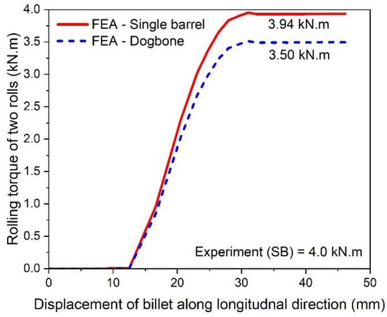 The variation in the rolling torque of two rollers is shown in Figure 14. It is clear that the rolling torque in a double barrel setup is lower than in case of the single barrel. The difference is approximately 12.6%, which also shows prominent reduction in the torque requirement for a double barrel billet shape. Furthermore, the simulation results of the single barrel setup are close enough to the experimental findings (error is ~1.52%). After calculating the torque, the power can be estimated through Equation (6) [] as follows: