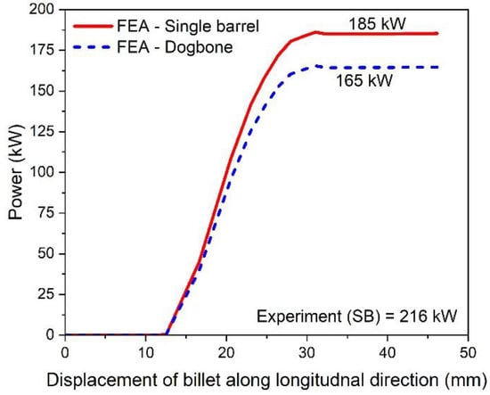 where, power is in watts, and is the rotational speed of the roll, which is taken as 47.1 rad/s or 449.77 RPM, as used in the slit rolling process. The power requirements of single and double barrels are illustrated in Figure 15. It is found that the required power for a double barrel is significantly reduced compared to for a single barrel (~12.12%). This could be considered as meaningful in a large industrial slit rolling setup where a unit power consumption makes huge difference in the overall cost of the product. The mechanical advantage—reduction in the rolling force and power of a double barrel steup could be mainly due to its geometry. As mentioned in Figure 8a,b, the initial rolling thickness of single and double barrels are 18.7 and 15.7 mm, respectively. This reduction favors double barrels in terms of overall power requirement to achieve the final thickness. In addition, the contact region in between the single barrel and roller is a crest, while it is a trough in a double barrel setup. This profile variation may also reduce its power requirements. This is one of the main outcomes of the current research, in which it is proven that the proposed geometry (double barrel) of the billet could increase the efficiency of the process. These results can be further investigated by improving the finite element model or the geometrical features of double barrel setups; this would be included in future research. In addition, as referred from Figure 15, the finite element results predict the experimental value of the power well. However, the error is 16.75%, which is considered high. Similar reasons, as mentioned above in case of rolling force, could lead to this variation.