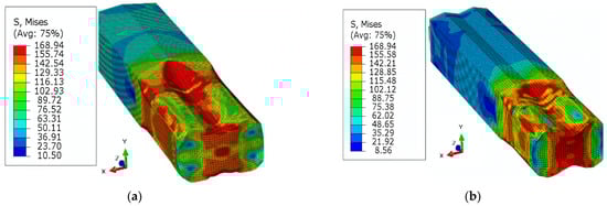 Von Mises stress distribution on the deformed strip after strip deformation by stand 14. (a) Strip deformed by grooved rolls; (b) strip deformed by grooveless rolls.