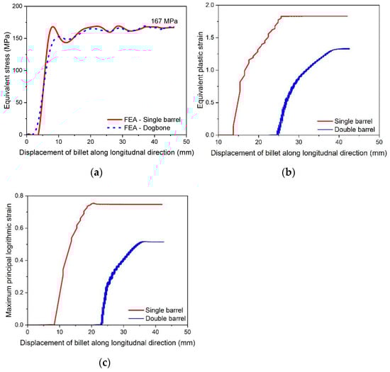 In addition to the process parameters, the material related factors are of the similar importance. The equivalent stress, Equivalent Plastic Strain (PEEQ), and maximum principal logarithmic strain (MPLS) are categorized as crucial parameters for the slit rolling process. These parameters’ contour plots for single and double barrels are shown in Figure 16, Figure 17 and Figure 18. Moreover, the variation of von Mises stress, PEEQ, and MPLS, with respect to billet displacement, are graphically shown in Figure 19. It is noted that these parameters represent the values of a single node, which is assumed to have maximum values of stress and strain since it lies at the direct contact region between billet and roller. It is evident that the maximum von Mises stress in single and double barrels has the similar magnitude of 168 MPa. However, there is a significant difference in the values of PEEQ and MPLS. The PEEQ for single and double barrels is 1.82 and 1.33, respectively, while the MPLS is, respectively, equal to 0.75 and 0.51.
