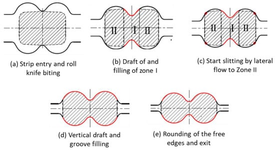 In the first stage of deformation (Figure 20a,b), the drafted zone (zone I) under the knife apex is deformed (mostly into spread) at the expense of an effective elongation. This occurs due to the coherence of the strip parts, which tends to equalize the speed of different parts of the strip that are exposed to a differential draft. Hence, the pulling down of less drafted parts (extreme zones) to the heavily drafted part (central zone) is stabilized by a forced lateral spread, i.e., the mass flows from the latter zone to the former one. The consumed work, during such a forced spread, is considered ineffective because it increases the stress localization and intensification at the knife apex (Figure 16a,b). Sever biting action (Figure 20a) is required for the deformation of a single barreled strip, produced by grooved edging rolls (Figure 4a). Upon deformation of the double barreled strip, generated by grooveless rolls (Figure 4b), biting would become much easier as its slitting pass begins with the second or the third step, shown in Figure 20b,c. The initial geometrical coincidence of the strip pass contacting surfaces (Figure 20b) increases effective elongation while decreasing forced spread by accelerating the full contact of the strip parts to the roll pass []. Figure 20 can also explain why the deformation of a single barreled strip is associated with higher levels of stress strains than that of double barreled strips. Suppressing the increased height (H) in the middle of the single barreled strip requires implementing more strain just to make it resemble that of the double barreled strip.