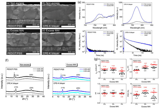 - Kim, S.; Jeong, J.-E.; Hong, J.; Lee, K.; Lee, M.J.; Woo, H.Y.; Hwang, I. Improved Interfacial Crystallization by Synergic Effects of Precursor Solution Stoichiometry and Conjugated Polyelectrolyte Interlayer for High Open-Circuit Voltage of Perovskite Photovoltaic Diodes. ACS Appl. Mater. Interfaces 2020, 12, 12328–12336. [Google Scholar] [CrossRef]