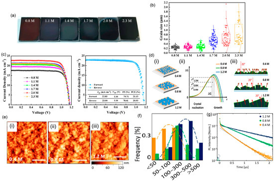 - Wieghold, S.; Correa-Baena, J.-P.; Nienhaus, L.; Sun, S.; Shulenberger, K.E.; Liu, Z.; Tresback, J.S.; Shin, S.S.; Bawendi, M.G.; Buonassisi, T. Precursor Concentration Affects Grain Size, Crystal Orientation, and Local Performance in Mixed-Ion Lead Perovskite Solar Cells. ACS Appl. Energy Mater. 2018, 1, 6801–6808. [Google Scholar] [CrossRef]