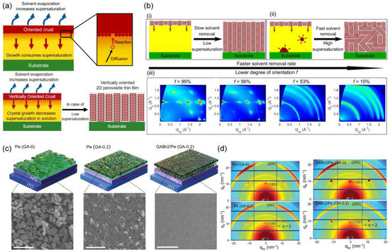 - Chen, A.Z.; Shiu, M.; Deng, X.; Mahmoud, M.; Zhang, D.; Foley, B.J.; Lee, S.-H.; Giri, G.; Choi, J.J. Understanding the Formation of Vertical Orientation in Two-dimensional Metal Halide Perovskite Thin Films. Chem. Mater. 2019, 31, 1336–1343. [Google Scholar] [CrossRef]