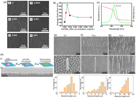 - Wang, P.; Xie, J.; Xiao, K.; Hu, H.; Cui, C.; Qiang, Y.; Lin, P.; Arivazhagan, V.; Xu, L.; Yang, Z.; et al. CH3NH3PbBr3 Quantum Dot-Induced Nucleation for High Performance Perovskite Light-Emitting Solar Cells. ACS Appl. Mater. Interfaces 2018, 10, 22320–22328. [Google Scholar] [CrossRef]