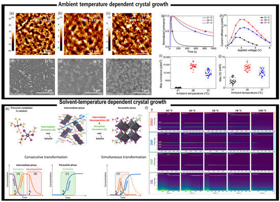 - Han, Y.; Wang, J.; Bischak, C.G.; Kim, S.; Lee, K.; Shin, D.; Lee, M.J.; Ginger, D.S.; Hwang, I. Significance of Ambient Temperature Control for Highly Reproducible Layered Perovskite Light-Emitting Diodes. ACS Photonics 2020, 7, 2489–2497. [Google Scholar] [CrossRef]