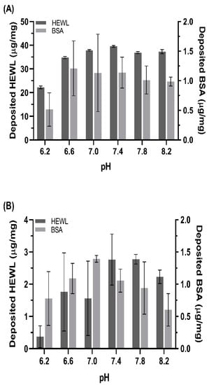 Only the level of HEWL deposition on etafilcon A was affected by the pH to a statistically significant degree (Table 2). This phenomenon is expected to be due to electrostatic interaction since etafilcon A and HEWL are expected to have negative and positive surface charges, respectively. The lower level of negatively charged BSA deposition on etafilcon A than HEWL supports this hypothesis. In recent reviews that described the chemical composition of soft materials and their properties, the preferable type of protein to deposit on the materials depending on the type of monomers is summarized [23,29]. According to those reviews, MAA gives a material negative surface charge, therefore attracting positively charged proteins such as lysozyme.