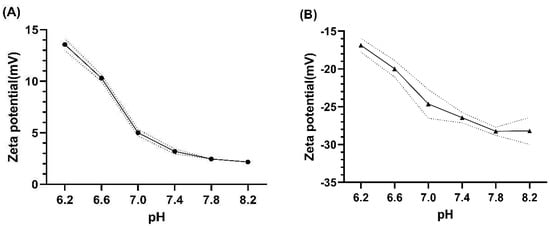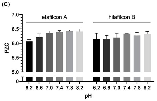 The of (A) etafilcon A and (B) hilafilcon B and (C) the PZC of etafilcon A and hilafilcon B equilibrated in PBS solutions (pH 6.2–8.2).