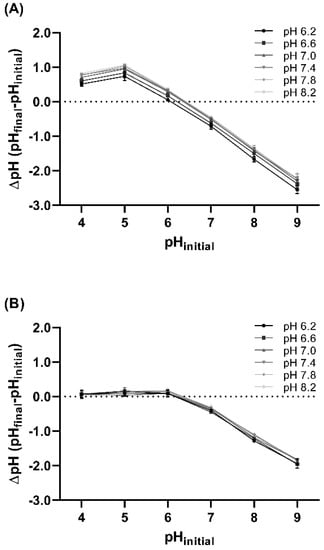 ) on (A) etafilcon A and (B) hilafilcon B in a range of pH.