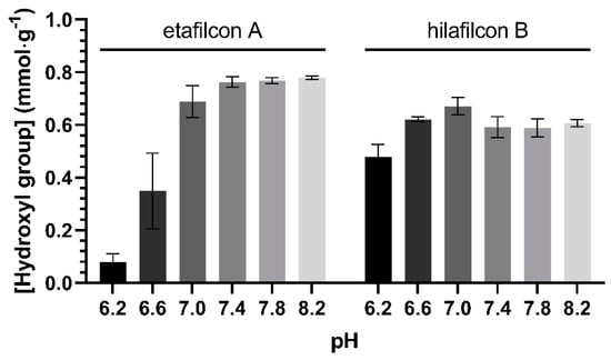 The hydroxyl group content in etafilcon A and hilafilcon B equilibrated in PBS solution (pH 6.2–8.2).