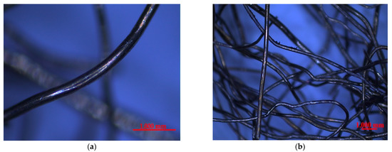 Steel cord fibers obtained from the recycling process: (a) one fiber; (b) a group of fibers.