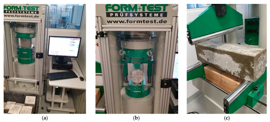 The compressive strength was determined by testing cubes with dimensions of 150 × 150 × 150 mm using a MEGA3–3000kN–100S testing machine (FORM TEST Prüffsys-teme, Riedlingen, Germany). The machine was set to increase the force from 0.2 to 1.0 MPa/s, and the entire test was carried out at a constant speed without any dynamic disturbances [39]. The specimens were placed with the troweled side perpendicular to the force action surface so that compression was transmitted on an even surface of the sample (see Figure 3a). The tensile splitting test was also carried out on the same testing machine according to the standard [40] (see Figure 3b). Samples with dimensions of 150 × 300 mm were positioned axially about the acting force. The load increment was set between 0.04 and 0.06 MPa/s. The flexural bending strength test was performed using the MEGA3–3000 kN–100 S testing machine according to the standard [41] (see Figure 3c). The concrete beams with dimensions of 150 × 150 × 600 mm were tested.