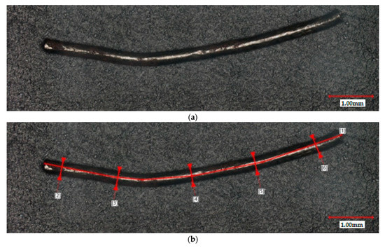 The steel cord fibers that were part of the concrete matrix had an average thickness in the range of 0.32 0.37 mm, as shown by the CLSM measures performed in points 2–6 (see Figure 6). Moreover, the length of the fiber, specified by line 1, differed between 17.0 and 20.0 mm depending on the tested fiber. The average aspect ratio of steel fiber was about 53. This is a result of the recycling process and its specificity, where only mechanical cuts and separation from the rubber particles of tires occur. This way, all fibers have hooked and waved shapes with different dimensions.