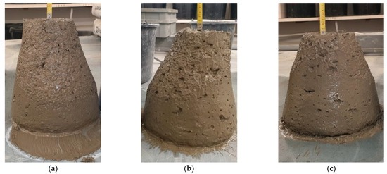 Concrete mixtures during the cone fall tests: (a) reference; (b) M1 modification; (c) M2 modification.