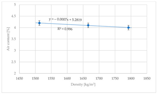 In regular and heavy concretes, the air content is determined based on the consistency class and density; however, this trend does not apply to lightweight concrete due to the high porosity of the aggregate (see Figure 8). Air particles that remain in the mix after the aeration step are 50 μm in diameter, which is why they easily penetrate the pores of the aggregate and stack there.
