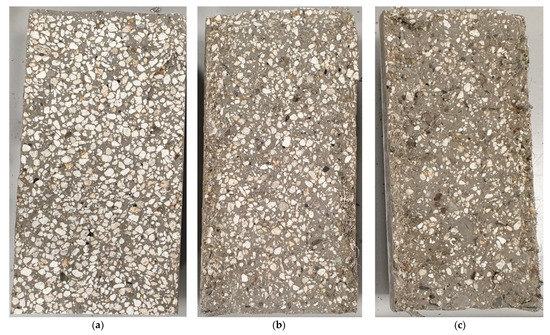 Figure 12 presents the samples after determining the tensile strength by splitting using the Brazilian method. Figure 12a presents the reference samples of lightweight concrete with a smooth crack through the aggregate. This means that the aggregate was not dusty, which was ensured by previously saturating it with water. Moreover, it shows that aggregate has a lower tensile strength than concrete. Figure 12b,c present the surfaces of M1 and M2 samples. The smaller share of aggregate content in the fracture area results from the greater share of damage in the binder. This may be because the cord stabilized the aggregate about the cement mortar, thanks to which the concrete was not destroyed in weak perlite grains but a much stronger cement mortar. This is consistent with the results of strength tests.