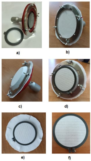 - trimming the excess fabric beyond the clamp circumference to obtain the specimen ready to be measured (Figure 2f).
