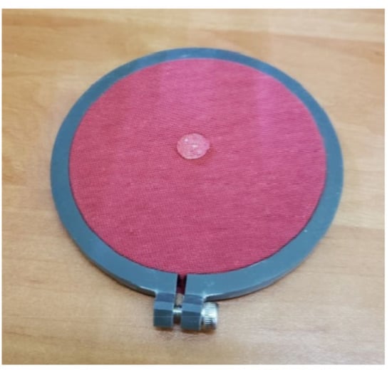 A drop of testing liquid on the fabric’s top surface after test performance by means of the MMT.