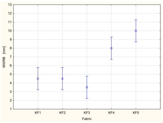 Very high values of the R parameter were stated for the fabrics KF5 (1021.32) and K4 (913.70). Negative values of the R parameter occurred for the fabrics KF3 (−370.50) and KF2 (R-59.64). The results of the R parameter are in agreement with the results of the BAR and MWRB parameters.