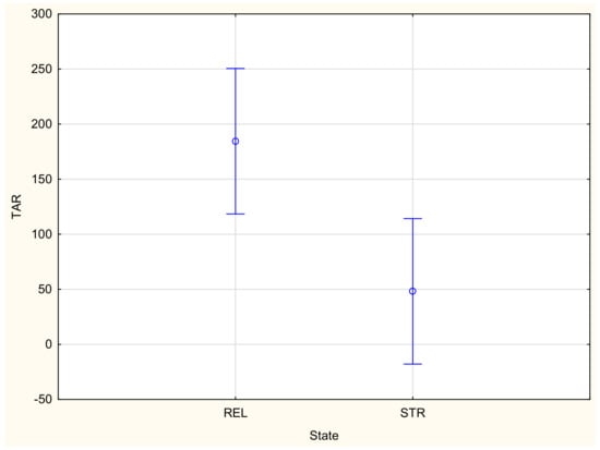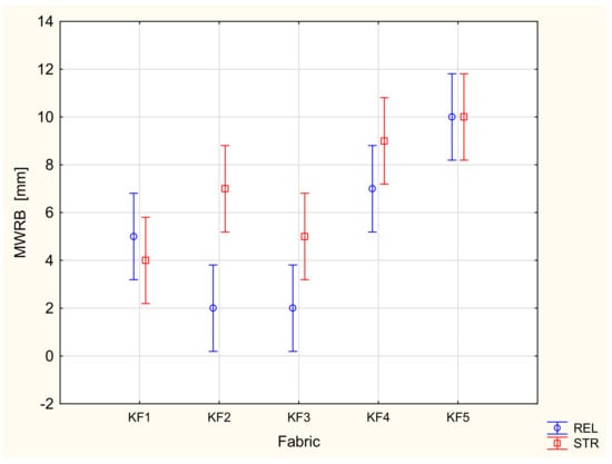 In the majority of cases, the results of the ANOVA confirmed that both main factors, the variant of the fabric and stretching, had a statistically significant influence on the parameters characterizing the liquid moisture transport through the knitted fabrics. This is in agreement with our previous studies [,]. The variant of the knitted fabrics significantly influenced the following parameters: TAR, SSB, MWRB (Figure 7), R and OMMC. The state (stretched/unstretched) had a statistically significant influence on WTT, WTB, TAR (Figure 8), SST, SSB, MWRT, MWRB, R and OMC. Only in the case of the BAR (absorption rate for the bottom surface), the influence of both independent variables was insignificant. The interaction between the independent variables was statistically significant only for two parameters: WTB and MWRB (Figure 9).