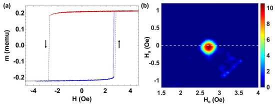 Figure 2b shows the corresponding FORC diagram. The coercivity distribution is obtained from the peak of the FORC distribution located around = (2.73,0) Oe [42,43]. Note that obtained from the FORC diagram takes the same value as the field for the magnetization switching or coercivity in the bistable loop—the dashed black line in Figure 2a. The observed spread in the FORC coercivity ( Oe) is ascribed to the intrinsic fluctuations of the switching process in the single microwire—blue lines in Figure 2a. Due to the symmetry, this case can be compared with the one proposed by the Moving Preisach model when the moving parameter (a proportional factor to the interaction field) is zero [44]. Indeed, this symmetrical FORC distribution is a proper candidate to be modeled by the classical Preisach model, equivalent to a hysteron with Oe and .