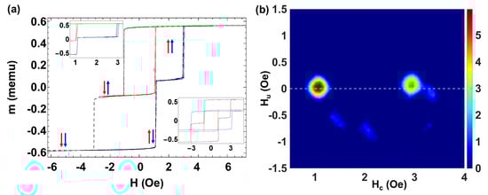 The corresponding FORC diagram is depicted in Figure 4b. Two symmetric distributions at Oe, Oe appears at both sides of the axis. Note that these values of are slightly higher than those of while . A third distribution at can be related to the cases in which both microwires reverse at the same time. The two smaller peaks at Oe, and Oe together with the rest of the diffuse distributions do not seem to have a clear physical meaning. Indeed, we interpret these data by assuming that the FORC algorithm treats the intrinsic fluctuations of the switching process as interactions, which are reflected in the diagram as extra peaks and thus break the direct interpretation of the diagram. Furthermore, let us also remark that due to the calculation of the mixed second derivative in Equation (10), data points near H = might produce slope discontinuities [45]. These calculation artifacts amplify measurement irregularities and give rise to noisier FORC diagrams [46,47].