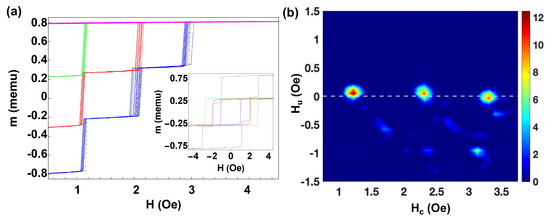 For a deeper understanding, we performed measurements for sets of a higher number of microwires. Figure 5 shows the FORC curves and the MHLs for a set of three microwires with different individual coercivities. The FORC curves with different sequences of jumps marked in different colors are shown in Figure 5a. The inset represents the MHLs for the individual microwires, the blue line corresponds to a microwire with Oe and memu, the red line corresponds to a microwire with Oe and memu, while the green line corresponds to a microwire with Oe and memu. The black dashed line corresponds to the MHL when the three microwires are placed together. Three clear Barkhausen jumps at Oe, Oe, and Oe and two plateaux of width Oe and Oe are distinguished. Although the interaction field between the microwires is weak, from the comparison between coercivities of isolated, , and interacting microwires, , we deduce that the interaction is positive for the microwire with smaller isolated coercivity (e.g., reinforces ), negative for the microwire with higher isolated coercivity (e.g., reduces ) and vanishes for the intermediate one.