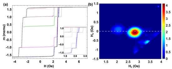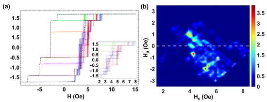 Figure 7b shows the corresponding FORC diagram, where we identify a rich distribution in coercivities and interaction fields. We observe six dominant peaks at Oe, Oe, Oe, Oe, Oe, and Oe and an elongated distribution along the Hc axis at Oe that can be related to the microwires with similar coercive fields. Two more diffused distributions at Oe and Oe are correlated to the microwires with higher coercive fields. Such a rich distribution is due to the intrinsic fluctuations of coercivity of the individual microwires that can be of the same order as the difference of coercivity of isolated microwires. In addition, several green-blue distributions in the range Oe are also observed. The presence of these additional distributions with no physical meaning makes the interpretation of the FORC diagram complex, particularly the identification of the FORC distributions related to the interactions between individual microwires, which cannot be directly related to the corresponding asymmetric MHL.