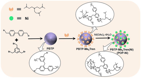 Nickel acetate tetrahydrate (2 mmol, 2.488 g) was dissolved in N, N-dimethylformamide (DMF, 25 mL) and filtered to obtain a clear solution. Then, PBTP-Me6Tren (0.1 g) was uniformly distributed in the above solution, and the reaction system was allowed to react under reflux at 90 °C for 6 h. After the reaction, the reaction product was washed thoroughly with a large amount of methanol and dried in a vacuum at 60 °C for 12 h to obtain a dark-brown powder.