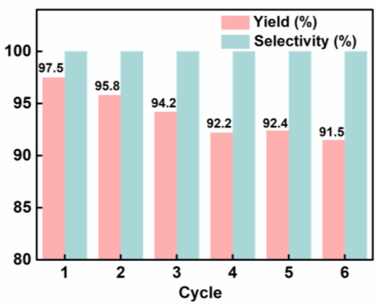 The surface morphology of the sample was characterized by means of scanning electron microscopy (SEM) on a JSM-6701F scanning electron microscope produced by Japan Electronics Co., Ltd. (Tokyo, Japan). The N2 sorption isotherms were performed on Quantachrome-EVO (Quantachrome, Hillsboro, OR, USA), and the sample powder was degassed at 150 °C in a vacuum for 12 h before measurement. By using Thermo Scientific K-Alpha (Thermo Fisher Scientific, Waltham, MA, USA), X-ray photoelectron spectroscopy (XPS) characterization was performed for the sample. Thermogravimetric analysis (TGA) was conducted by using Netzsch TG209-F3 (Netzsch, Selbu, Germany) in an N2 atmosphere. The reaction yield was detected using the Shimadzu GC2010-QP2010Plus gas chromatography mass spectrometer (GC-MS) (Shimadzu, Japan) with the gas chromatography column of Agilent J&W HP-5, and the GC column temperature was programmed at 32–150 °C at a rate of 8 °C/min.