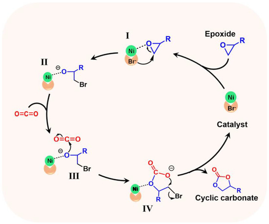 Based on the previous reports [44,46] and our experimental results, the reaction pathway of CO2 cycloaddition catalyzed by POP-Ni was proposed (Figure 5). Firstly, the epoxide was activated through the Ni2+ active site in the catalyst to coordinate with the O atom of the epoxide. Then, the nucleophilic Br anion attacked the carbon atom on the side of the epoxy with less hindrance through a nucleophilic attack to open up the ring (I), thus obtaining the ring-opening O anion intermediate (II). Intermediate II further launches nucleophilic attacks on CO2 (III) to obtain carbonate intermediate (IV). Finally, the product cyclic carbonate is obtained through intramolecular substitution. At the same time, the catalyst is released for further catalysis.