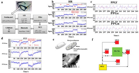 (a) The eyeglasses-based PPG measurement device; (b) The averaged HR; (c) PPGf, PPGe, and PPGnrch are PPG measured from the finger, ear, and nose, respectively; (d) The averaged PTT; Reproduced with the permission of [56]. Copyright 2012, IEEE. (e) Prototype of a wearable sensing device; Reproduced with the permission of [57]. Copyright 2013, IEEE. (f) Block diagram for the proposed 4-LED/one-photodiode PPG sensor. Reproduced with the permission of [44]. Copyright 2016, IEEE.