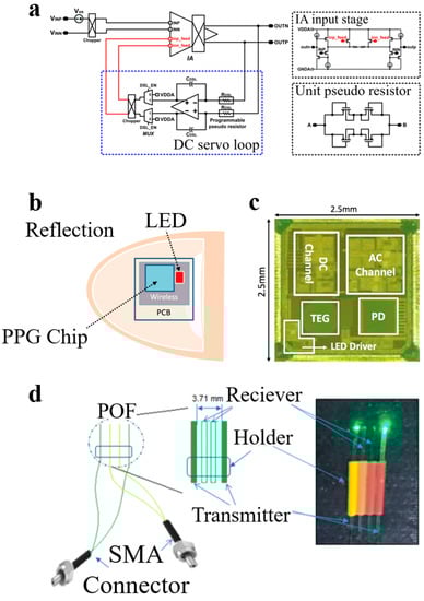 (a) DC servo loop; Reproduced with the permission of [59]. (b) Trans-nail pulse-wave monitoring system in reflection mode; (c) Microphotograph of the fabricated chip; Reproduced with the permission of [61]. (d) POF PPG probe. Reproduced with the permission of [62].