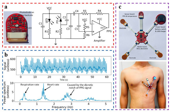 (a) PPG sensor (20 mm × 16 mm) and circuit diagram of the active low-pass filter; (b) Signals collected by the PPG sensor and spectrum analysis of the PPG signals after removing the dc component; (c) Rigid-flex design of the sensor patch for health monitoring. Reproduced with the permission of [64]. Copyright 2020, IEEE.