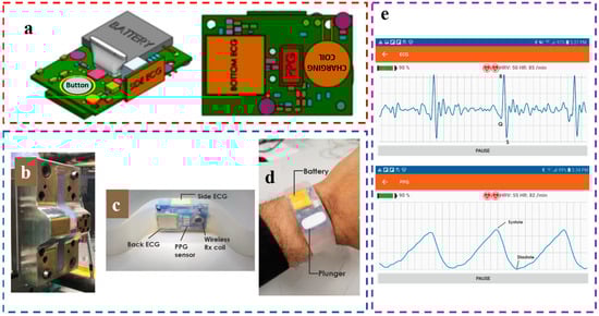 (a) Top and bottom views of the mechanical CAD model showing component placement following complete assembly; (b) An over-molded PCBA in clear silicone; (c) Some visible components labeled; (d) Wearable wristband; (e) App UI showing the live ECG signal and PPG signal. Reproduced with permission from [65].