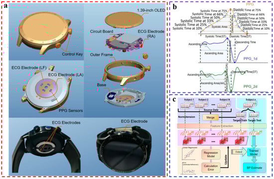 (a) Smartwatch that can collect ECG and PPG signals synchronously; (b) Time-domain features extracted from a single pulse period; (c) Process of the personal calibration mode based on transfer learning. Reproduced with the permission of [8]. Copyright 2022, Elsevier.