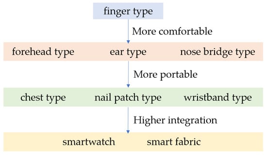 In the past 15 years, PPG technology has developed rapidly, and more and more researchers are paying attention to the field of wearable medical devices. As shown in Figure 10, in terms of the design of the PPG sensor, from the initial finger type to forehead type, ear type, nose bridge type, and then from chest type, nail patch type to wristband type, the PPG technology in the comfort, portability, and other aspects has continuous improvement. In terms of application scenarios of PPG sensor, from placing the sensor on the finger, forehead, nose bridge, earlobe, wrist, and other body parts to integrating multiple sensors into the smart fabric and smartwatch, it provides a scene that is easier to promote its practical application, among which smartwatch is regarded as one of the most potential development directions. However, there are still many problems to be solved for PPG sensors, such as motion artifacts, which are a major difficulty in achieving the stable performance of PPG sensors in daily life. More research needs to focus on the impact of posture changes on PPG signals. In addition, the application needs of the home level also put forward higher requirements for the lightness and integration of wearable devices.