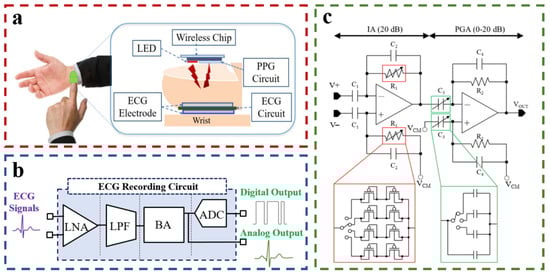 When using an ECG device to measure ECG signals, a ground electrode is usually required as a reference (usually placed on the right leg). Other electrodes are often placed far away from the right leg, resulting in a decrease in the integration of the system. In 2018, Lee et al. designed a small device capable of measuring ECG signals at the fingertips (Figure 11a) [31]. The circuit framework is shown in Figure 11b, which is mainly composed of a low-noise amplifier (LNA), low-pass filter (LPF), and buffer amplifier (BA). The LNA is a combination of an instrumentation amplifier (IA) and a programmable gain amplifier (PGA). Operational transconductance amplifiers (OTA) are used as the active circuit element (Figure 11c). The maximum gain that the LNA is designed to achieve is 40 dB. The ECG signal is passed through a low-pass filter (LPF) with adjustable cutoff frequencies of 0.2−10 kHz. The signal is amplified by a buffer amplifier (BA) with a variable gain of 0−20 dB. To avoid the use of a grounded electrode, a stable voltage of 0.9 V (VCM) was provided to enable the ECG signal acquisition at the fingertips using only two electrodes. To achieve low cutoff frequencies (such as 1 Hz), MOSFET resistors are used to provide resistance in the range of gigaohms while maintaining a small active area (2.53 mm2). This approach makes the ECG device more compact and integrated.