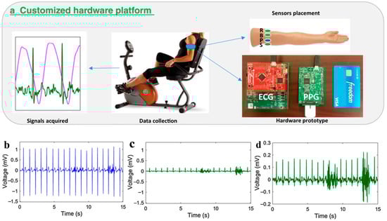 (a) Customized hardware platform; (b) chest-ECG; (c,d) arm-ECG. Reproduced with the permission of [70].