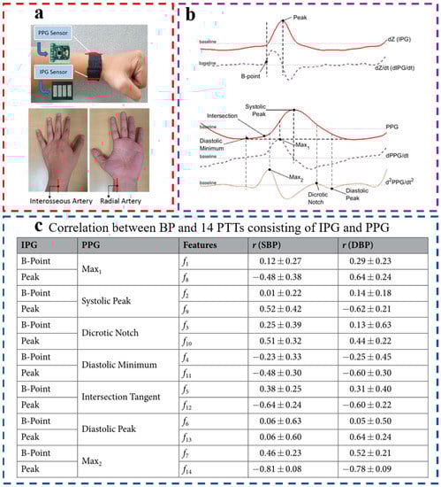 Based on many studies, we found that the PTT derived from ECG and PPG signals has a high correlation with SBP but a low correlation with DBP, which makes it difficult to improve the accuracy of DBP estimation. Therefore, it is necessary to find an indicator with a high correlation with both SBP and DBP. In 2019, Rachim et al. proposed a multi-mode wrist biosensor (Figure 13a) [72], which uses an impedance volume signal (IPG) instead of an ECG signal. Various characteristics of IPG and PPG were used to derive a variety of PTT for BP estimation, and finally, the best PTT characteristics were determined. As shown in Figure 13b, the zero-crossing position before the peak value and the maximum derivative of IPG was extracted, seven feature points (such as the PPG contraction peak, PPG relaxation peak, etc.) were extracted from the first derivative of PPG and the second derivative of PPG, thus forming 14 kinds of PTT, and the exponential function was used to estimate BP. The correlation between the PTT and BP formed by each IPG feature and PPG feature is shown in Figure 13c; PPT14 (f14) has the highest correlation with BP, the correlation with SBP is 0.81 ± 0.08, and the correlation with DBP is 0.78 ± 0.09. PPT14 is the interval between the peak value of IPG and the peak value of the second derivative of PPG. After the same exponential-type function was used to estimate BP. The PTT derived from ECG and PPG was highly correlated with SBP (−0.83 ± 0.17) but less correlated with DBP (−0.63 ± 0.14). Therefore, the PTT derived from IPG and PPG had a higher correlation with BP; this is helpful in improving the accuracy of BP estimation. This study also shows that the extraction of PPT does not have to just rely on PPG and ECG; more physiological signals can be mined to derive PTT, and more feature points can be reasonably extracted from various physiological signals to optimize the calculation of PTT. However, most current studies derive PTT based on PPG and ECG; few studies use other signals to derive PTT. This may be a way to improve the correlation between PTT and BP and the accuracy of BP estimation in the future to try to extract PTT by combining it with other physiological signals.