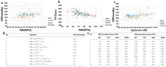 In 2016, Hsiao et al. added different physiological parameters to the BP estimation equation (Table 1) to select the best parameter combination [78]. As can be observed in Table 1, Hsiao et al. tried to add various physiological parameters to the equation. The experimental results show that the error decreases when one more physiological parameter is added to the equation. On the one hand, it can be seen from Figure 14a,b that HR has a greater impact on PTT than on SBP. For both men and women, the data in Figure 14b tend to have a higher correlation than those in Figure 14a. Therefore, it is necessary to include HR in BP estimation to correct PTT. On the other hand, it can be seen from Figure 14c that SBP is proportional to age, that is, BP increases with age, but the BP of women is generally lower than that of men. Therefore, different estimation equations should be provided for different genders. The final experimental results show that the error of SBP is 6.9 mmHg ± 8.6 mmHg, which does not meet the AAMI standard (5 mmHg ± 8 mmHg) but was close enough to indicate the feasibility of introducing physiological parameters other than PTT into the BP estimation equation.