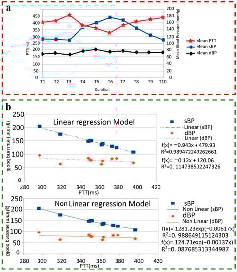 In 2017, Aboughaly et al. compared the accuracy of linear and nonlinear BP regression models on the same dataset, in which the nonlinear BP regression model selected an exponential-type function [79]. After calculation, in the linear regression model, PTT and SBP have strong correlation characteristics (Figure 15a), with 0.92~0.99, but the correlation between PTT and DBP is very weak. As shown in Figure 15b, the linear model assumes negative values of PTT for high BP values and vice versa, while the nonlinear model provides a more realistic prediction for the relationship between PPT and BP. Therefore, the nonlinear model may be the future BP estimation equation’s main form.