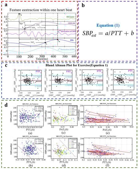 (a) Samples of ECG, CWR, PPG, the second derivative of CWRs, and the first derivative of PPGs for a subject in a standing position; (b) BP estimation equation; (c) Bland–Altman plots for exercise tasks using Equation (1); (d) Fitted curves of PTT and PAT to BP. Reproduced with the permission of [81].
