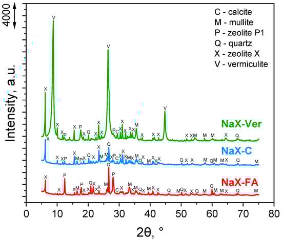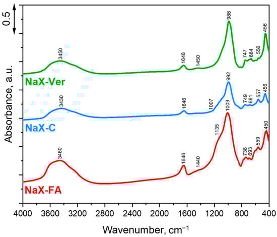 The FTIR spectra are presented in Figure 2. The bands at about 3800–3000−1 and 1645 cm−1 were assigned to stretching and bending vibrations of H2O molecules, respectively. Bridging OH− groups were indicated by lower wavenumbers in the case of zeolite NaX–FA and composites NaX–C, NaX–Ver in the range of 3400–3500 cm−1, and is a common observation for faujasite-type zeolites [,]. All samples contain an admixture of calcite (Figure 1) as the bands attributed to CO32− vibrations are visible at ∼1450 cm−1. The peak at 1135 cm−1 registered for NaX–FA, NaX–C, and NaX–Ver can originate from the stretching vibration of C-OH [], the effect of the presence of unburned coal in the composition of the samples. The main bands in the FTIR spectra of the samples were associated with the structural Si–O (Si) and Si–O (Al) tetrahedra vibrations in the range from 1200 to 400 cm−1. Bands in the region from 1250 to 920 cm−1 were assigned to the internal vibration of the TO4 (T = Si or Al) tetrahedra. A high peak at around 990 cm−1 refers to a well-defined skeleton of aluminosilicate formed in the samples—the band can be assigned to the asymmetric stretching vibrations of bridge bonds Si–O(Si) and Si–O(Al) in the zeolite and vermiculite frameworks. In the range of 800–500 cm−1, so-called pseudo-lattice vibrations originating from over-tetrahedral structural units ([SiO4] and [AlO4] tetrahedra) can be observed []. The bands at about 450 cm−1 were assigned to the internal vibrations due to the bending of the T–O tetrahedra []. In the case of NaX–Ver, the peak at 456 cm−1 is higher compared to the NaX–FA and NaX–C because it is additionally attributed to the bending of Si–O–M vibrations (where M = Al, Fe, Mg, or Si), typically for exfoliated vermiculite [].