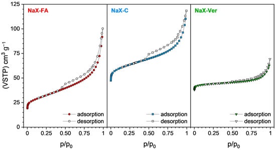 Textural parameters were determined for NaX–FA zeolite, and NaX–C and NaX–Ver composites (Table 2). All investigated materials NaX–FA, NaX–C, and NaX–Ver have a type IV isotherm with a hysteresis loop of type H3 (Figure 3). This can be related to a mesoporous character and the formation of slit-shaped pores. A significant increase in the nitrogen adsorption at low p/p0 observed for the NaX–C indicates a high contribution of micropores. This has been confirmed by the Vmic value (Table 2); micropores are 51% of the Vtot, which reflects the high contribution of fine pores in NaX–C. A much lower contribution of micropores (28%) is attributed to the NaX–FA, where mesopores dominate (65%). The results presented in Table 2 show that the proportion of micropores in this sample is 66%. This indicates the microporous nature of the vermiculite that is part of this composite. The pHpzc values of the zeolites are summarized in Table 2. The pHpzc values were found to be high, probably due to the high amount of mobile alkaline metals (sodium and potassium) as well as alkaline earth metals (calcium and magnesium). The correlation of ΔpH vs. initial pH (pHi) is presented in Figure S1.